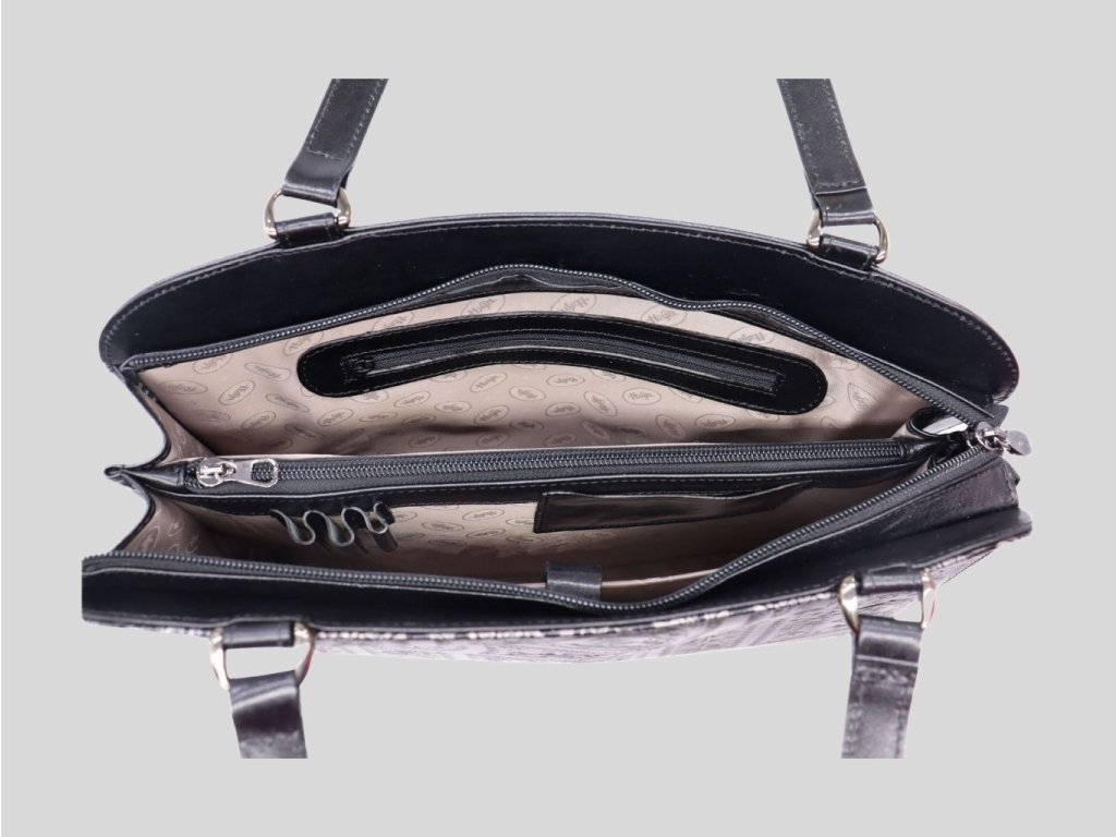 Vnútorná výbava: * 2 x hlavná separácia * 1 x zipsová medzistena * 1 x výklopné vrecko na voľne stojace dokumenty * 1 x kožené puzdro na mobilný telefón * 1 x malé dokladové vrecko na zips * 1 x priehradka na vizitky * 3 x pútko na pero