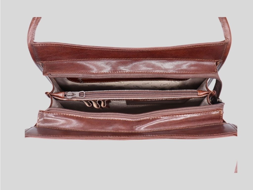Vnútorná výbava: * 2 x hlavná separácia * 1 x zipsová medzistena * 1 x zipsové vrecko * 1 x kožené puzdro na mobilný telefón * 1 x priehradka na vizitky * 3 x pútko na pero