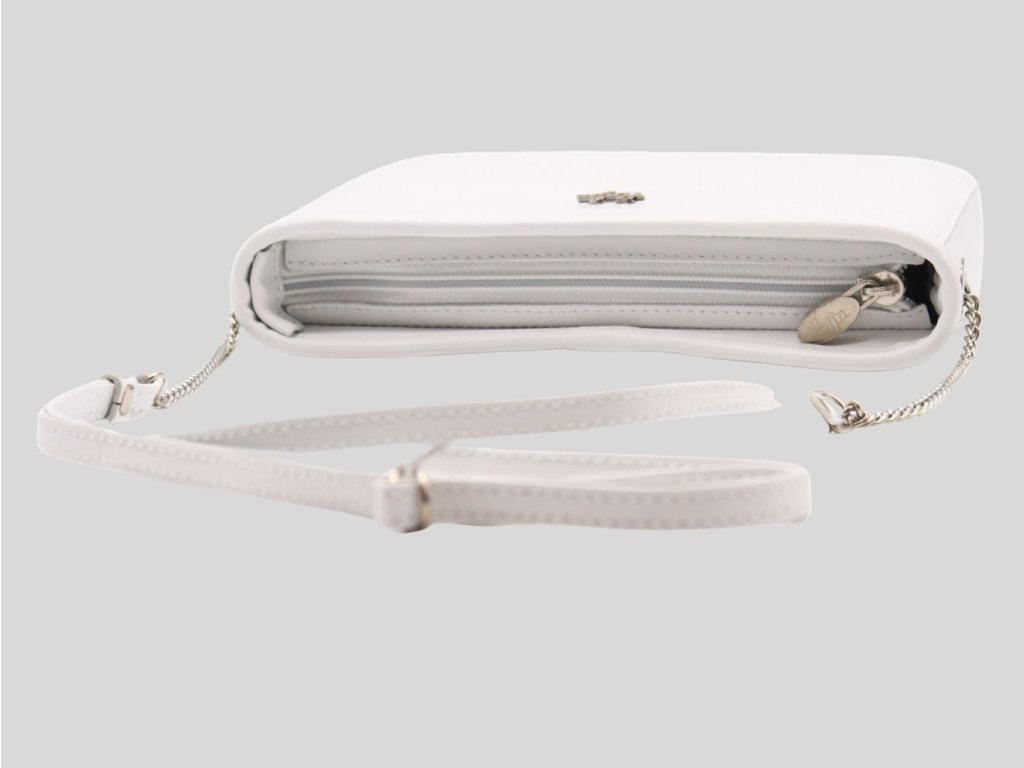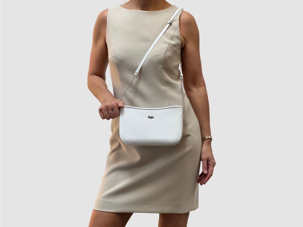 Kožená kabelka v klasickej snehobielej farbe. Remienko nápadito doplnené striebornou retiazkou, a nielen tým sa stáva kabelka zaujímavým módnym doplnkom. Elegantne doplní celú garderóbu, ak sa idete zabaviť na svadbu, večierok, či na rande...Alebo len tak bude vašou spoločníčkou kamkoľvek pôjdete.