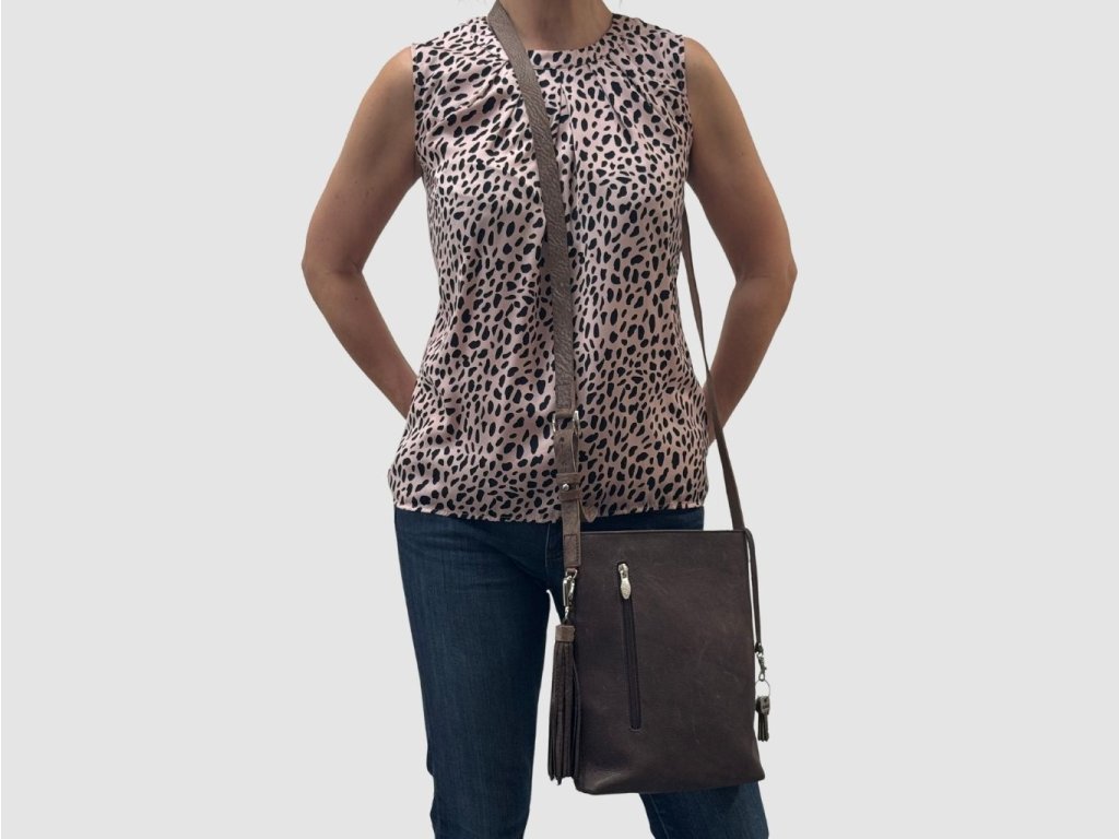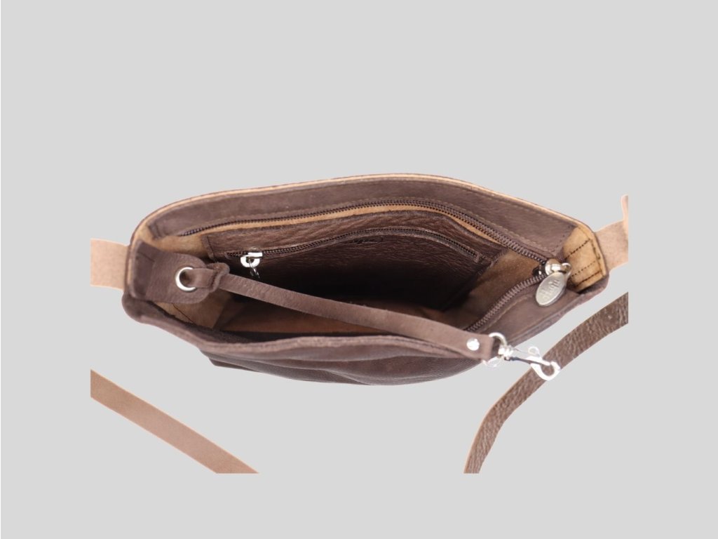 Kožená kabelka ozdobená príveskom so strapcami, ktoré sú túto sezónu in, nielen pre tých, ktorí milujú retro, country, boho štýl. Je pre vás ako stvorená. Ako bonus je prívesok na kľúče zavesený na koženom pútku pripevnenom vo vnútri kabelky. V prevedení prírodnej hnedej brúsenej pôsobí veľmi príjemne a na dotyk ešte príjemnejšie. Kvalitný a praktický spoločník.