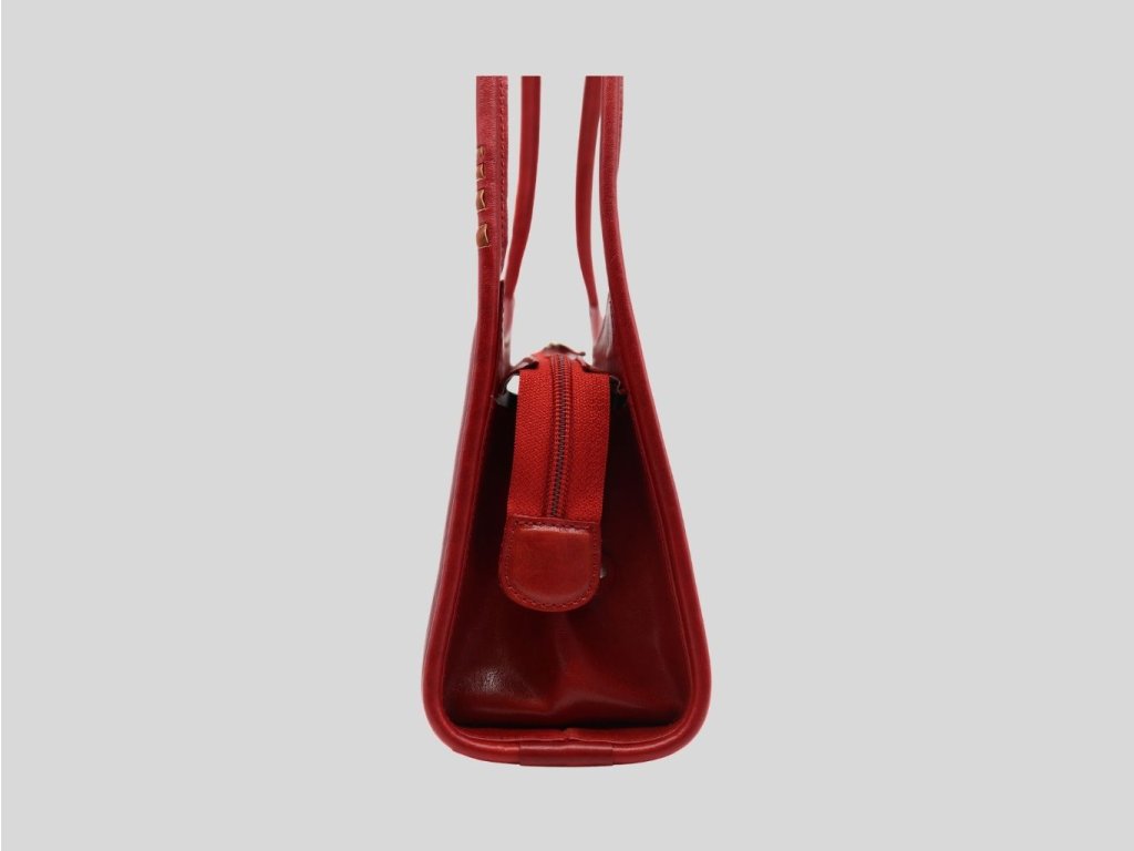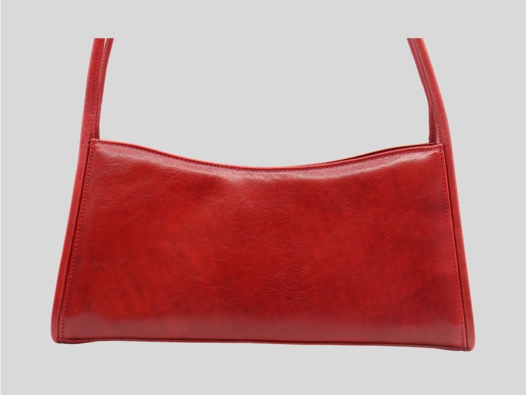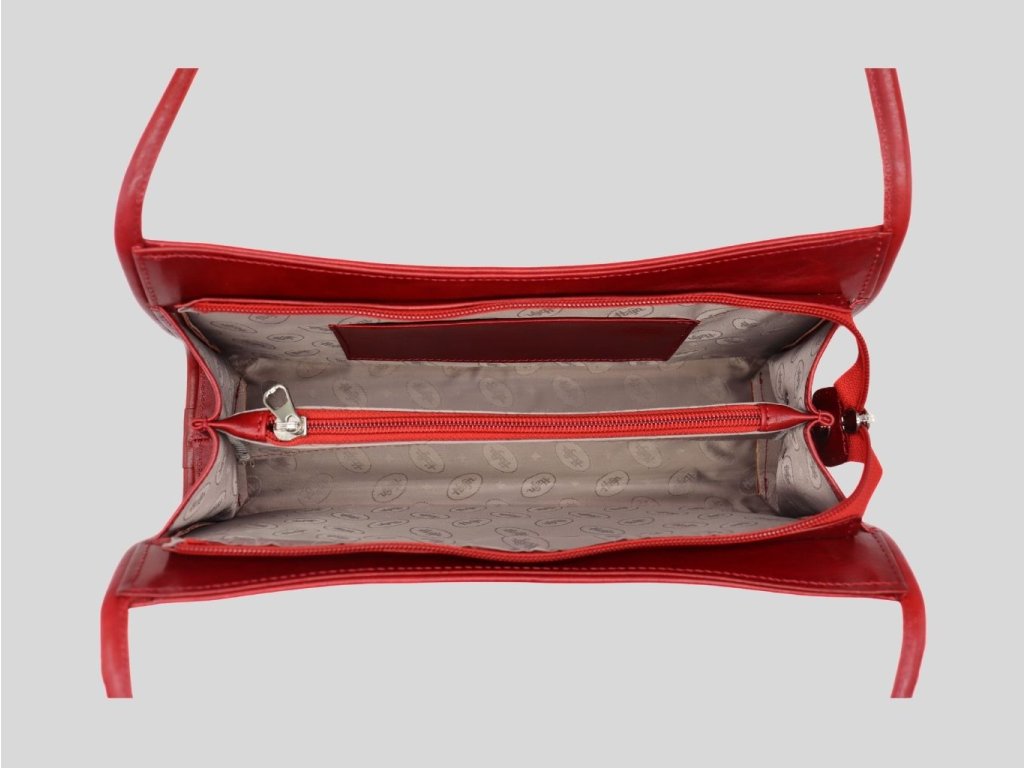 Kožená kabelka v príťažlivej žiarivej červenej farbe, ktorá je farbou lásky, vášne, energie a životnej sily, s hnedými detailmi na prednej strane a na predných remienkach upúta ihneď pozornosť. Pôsobí veľmi elegantne a so správnymi doplnkami s ňou očaríte okolie na prvý pohľad a dodá vám ten správny šmrnc. Kvalitný a šik módny doplnok.