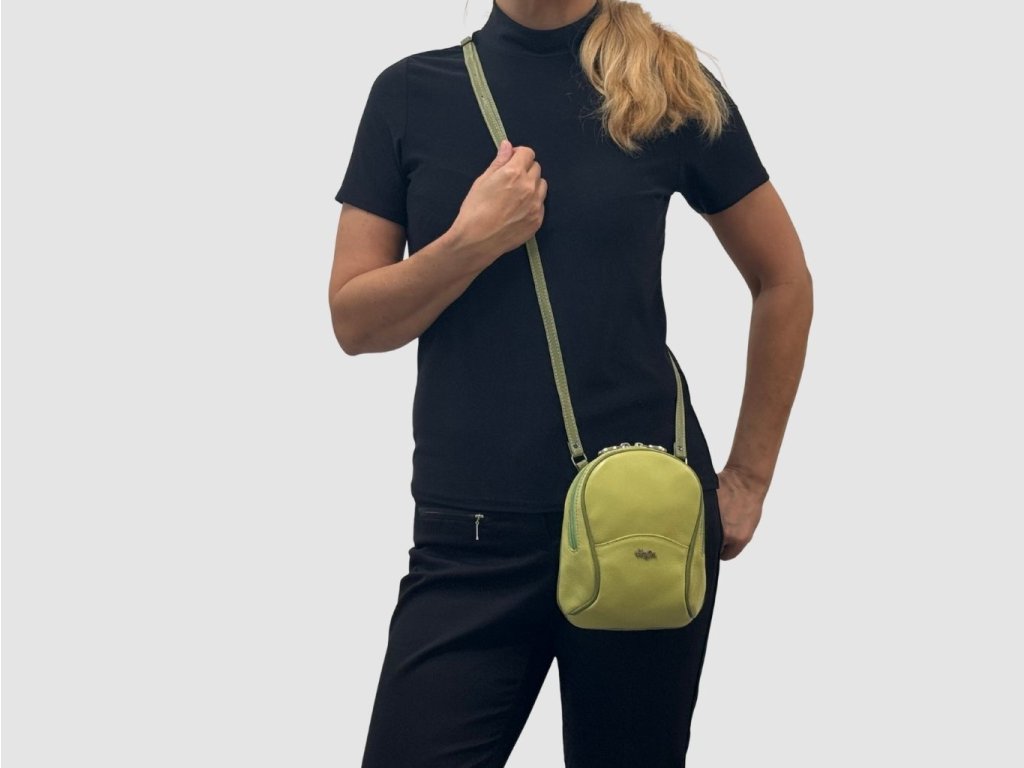 Kožená kabelka menšia skôr ako batôžtek vhodná aj pre slečny - veľké parádnice, kde si ukryjú svoje poklady. Je praktická aj pre tie dámy, ktoré radi majú voľné ruky, napr. mamičky na prechádzke so svojimi ratolesťami, keď číhajú na každý ich krok a neraz musia za nimi pobehnúť. V jemnej pastelovej farbe ideálna nielen k letným šatám či šortkám.