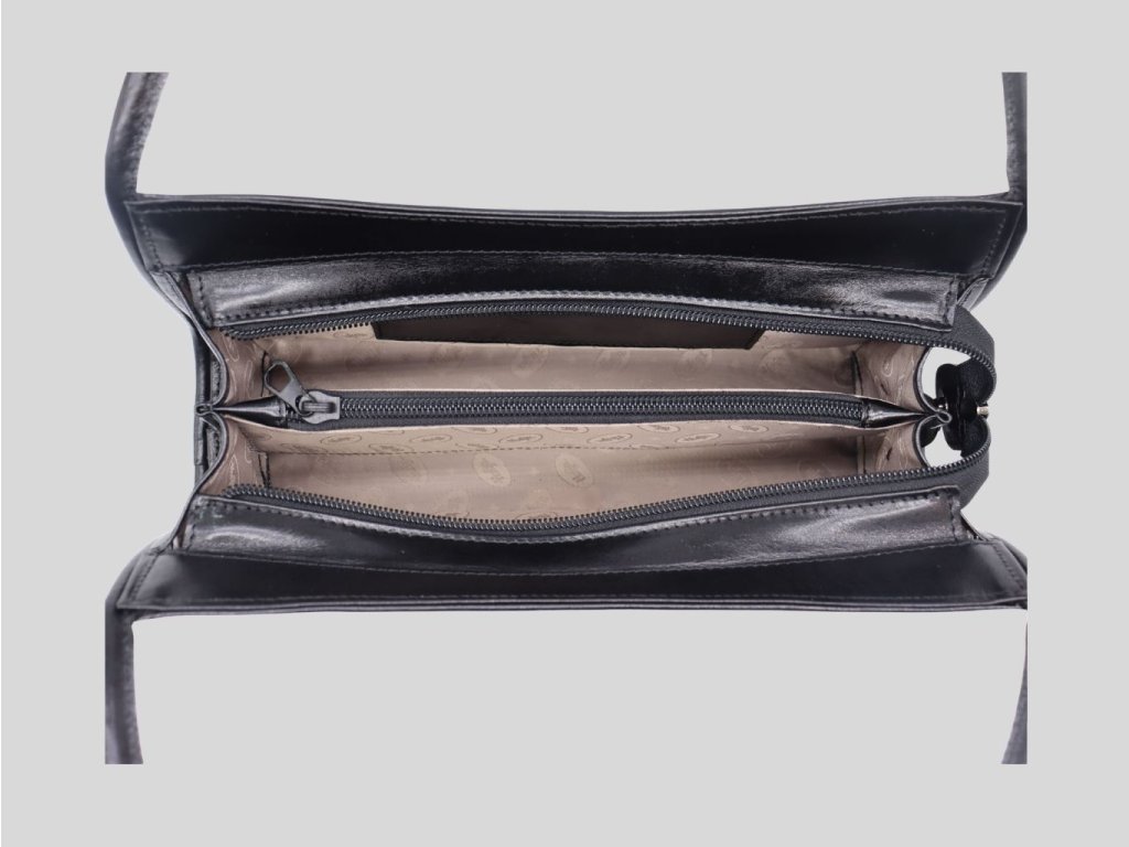 Kožená kabelka v príťažlivej čiernej farbe so sivými detailmi na prednej strane a na predných remienkach upúta svojím vkusom. Pôsobí veľmi elegantne a štýlovo, preto ňou očaríte okolie na prvý pohľad. Kvalitný módny doplnok, ktorý si obľúbite a bude vám robiť radosť.