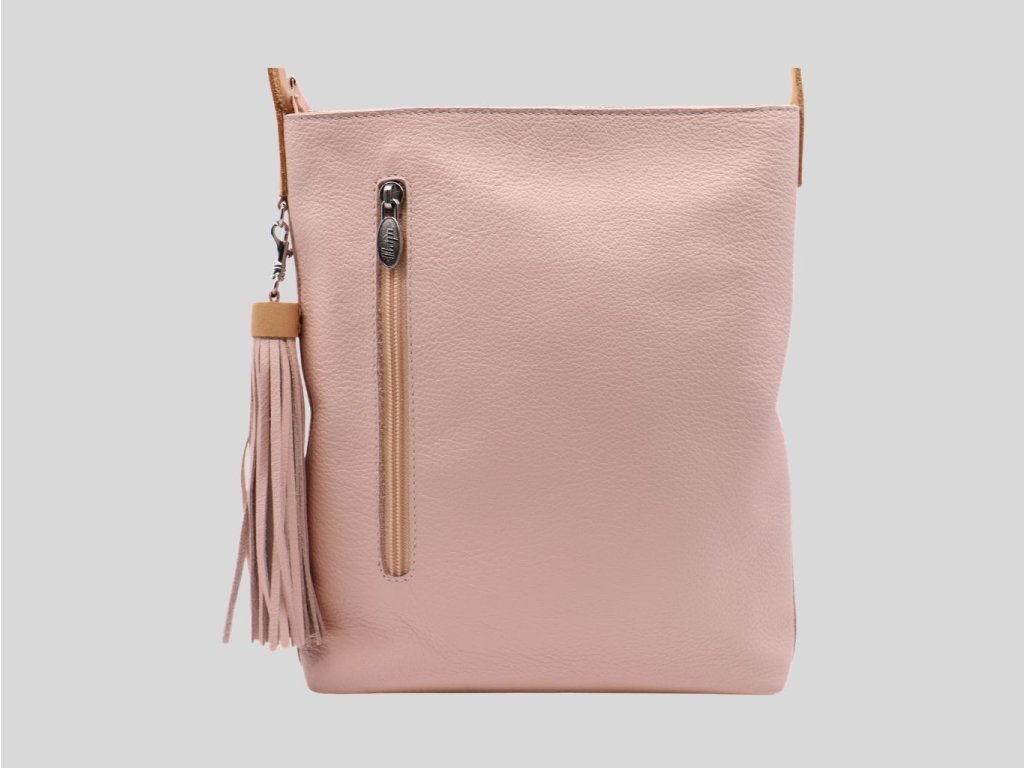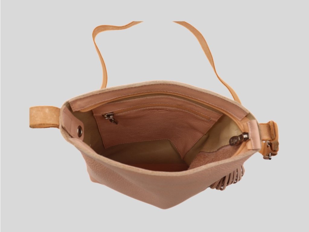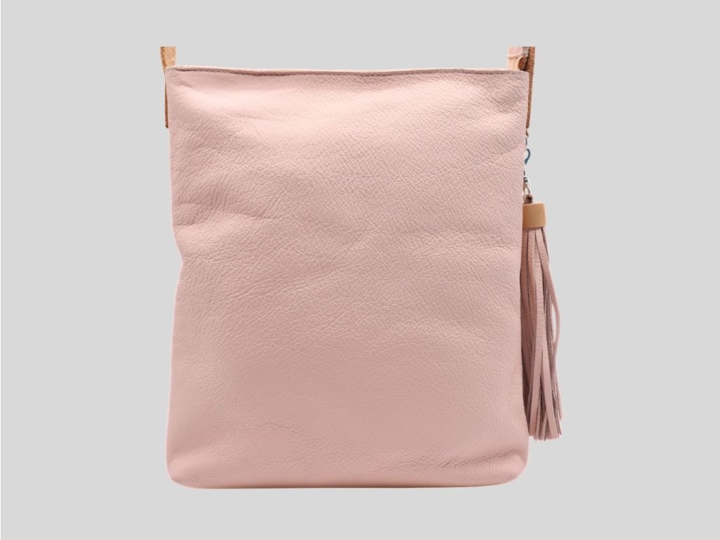 Kožená kabelka s príveskom so strapcami, ktoré sú túto sezónu v kurze, nielen pre tých, ktorí milujú retro, country, boho štýl. Je pre vás ako stvorená. V prevedení jemnej ružovej ľahko zladíte s čímkoľvek. Vďaka variabilnému remienku ju môžete nosiť na jednom ramene alebo ako crossbody.