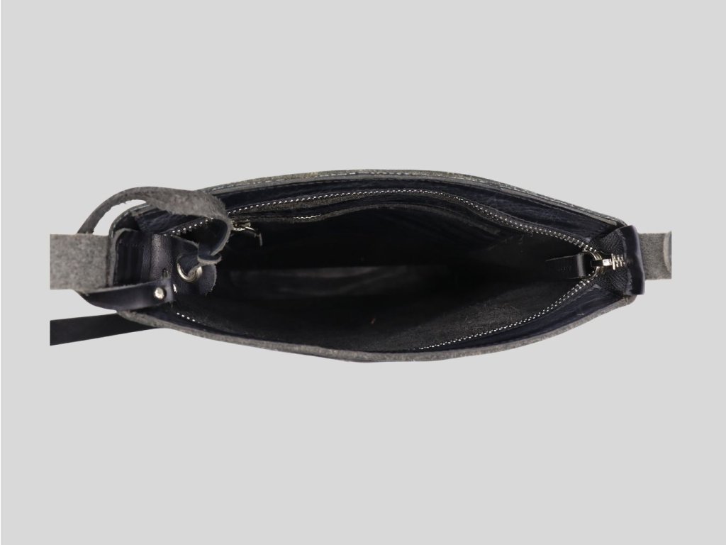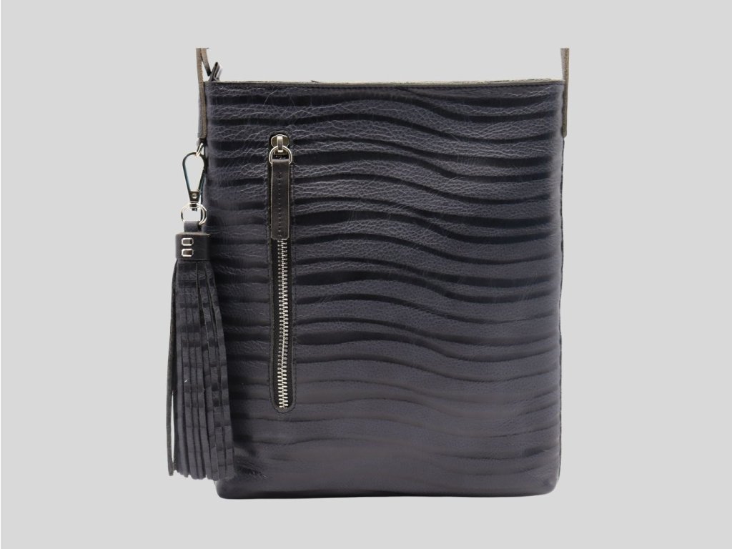 Kožená kabelka ozdobená príveskom so strapcami, ktoré sú túto sezónu v obľube, nielen pre tých, ktorí milujú retro, country, boho štýl. Je pre vás ako stvorená. V prevedení krásnej antracitovej farbe so zaujímavým zebrovým vzorom ľahko zladíte s čímkoľvek. Ako bonus ponúka všitý prívesok s karabínou na kľúče.