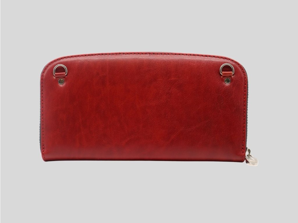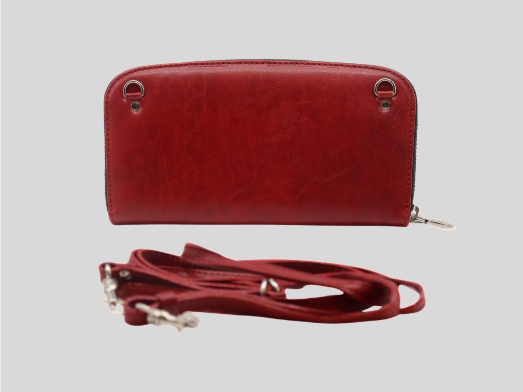 Kožená kabelko-peňaženka v príťažlivej žiarivej červenej farbe, ktorá je farbou lásky, vášne, energie a životnej sily. Možnosť úpravy ako kabelka na rameno, aj do ruky, alebo crossbody. Zároveň slúži aj ako plnohodnotná peňaženka. Nezvyčajným prevedením dva v jednom ňou určite svoje okolie zaujmete. Kvalitný a pekný módny doplnok, ktorým potešíte seba alebo niekoho blízkeho.