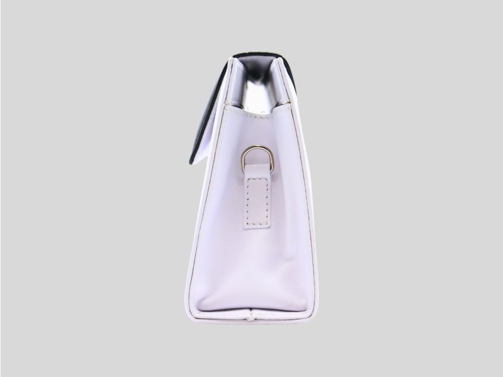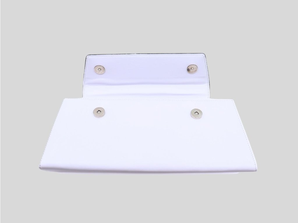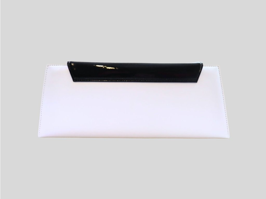 Kožená listová kabelka v snehobielej farbe v kombinácii s čiernou lakovanou chlopňou. Súčasťou je pripojiteľné remienko. Jemné a neutrálne prevedenie umožňuje elegantne a vkusne vyladiť celú garderóbu, ak sa idete zabaviť na ples, večierok, svadbu... Kvalitný módny doplnok do spoločnosti.