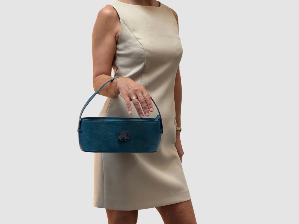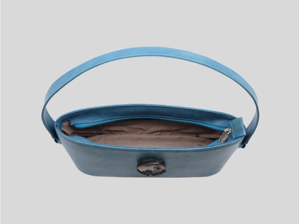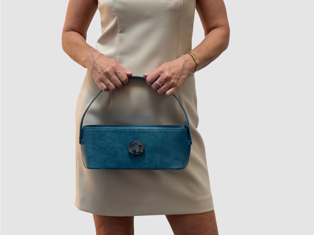 Kožená listová kabelka v krásnej svetlomodrej farbe. Ikonický šperk Krištáľ, ktorý je magický a zvláštny, ako detail, len podčiarkuje jej výnimočnosť. Môže dokonale doladiť vašu garderóbu do úplného detailu, či už to bude ples, svadba, večierok, alebo...Kvalitná spoločníčka na každú príležitosť.