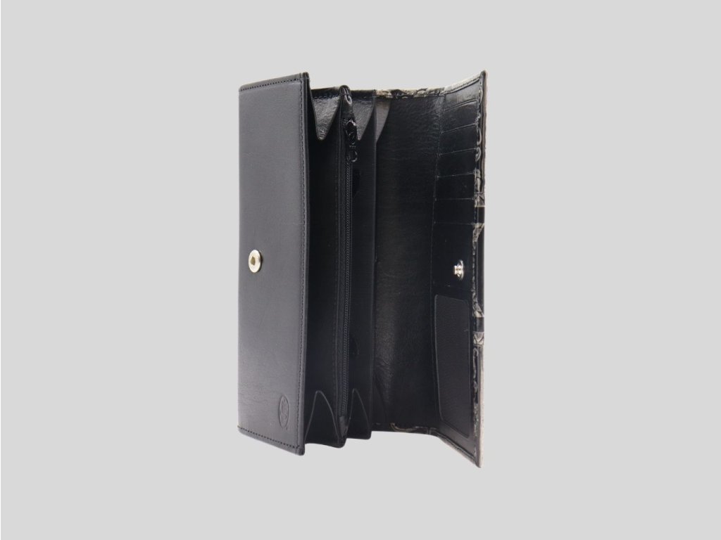 Vnútorná výbava: * 3 x priehradka na papierové bankovky * 1 x zipsové vrecko na kovové mince * 15 x priehradka na vizitky a kreditné karty * 1 x priehľadné okienko so sieťkou * 1 x vrecko na vnútornej strane chlopne * 1 x vrecko na zadnej časti peňaženky