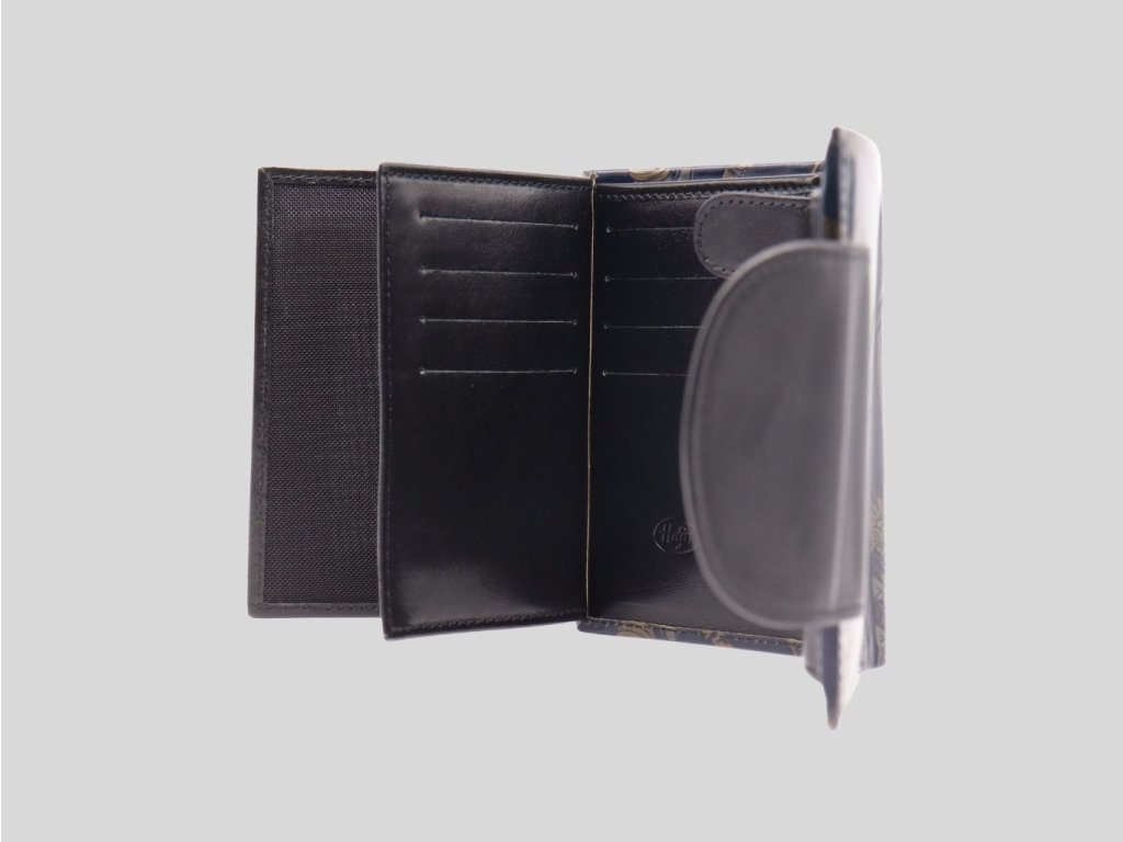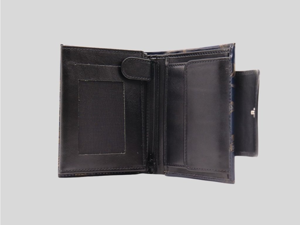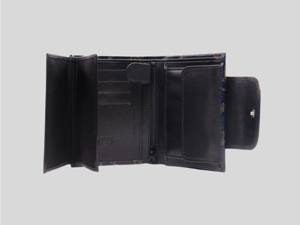 Vnútorná výbava: * 2 x priehradka na papierové bankovky * 1 x chlopňové vrecko na kovové mince * 1 x menšie priehľadné okienko so sieťkou * 2 x priehľadné okienko so sieťkou na osobné doklady * 1 x zipsové vrecko * 8 x priehradka na vizitky a kreditné karty * 1 x skryté vrecko